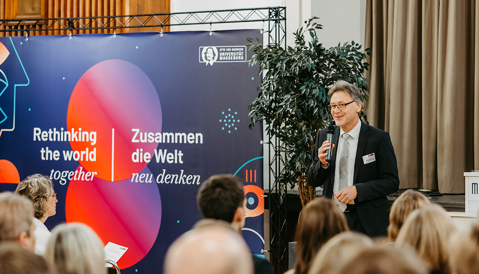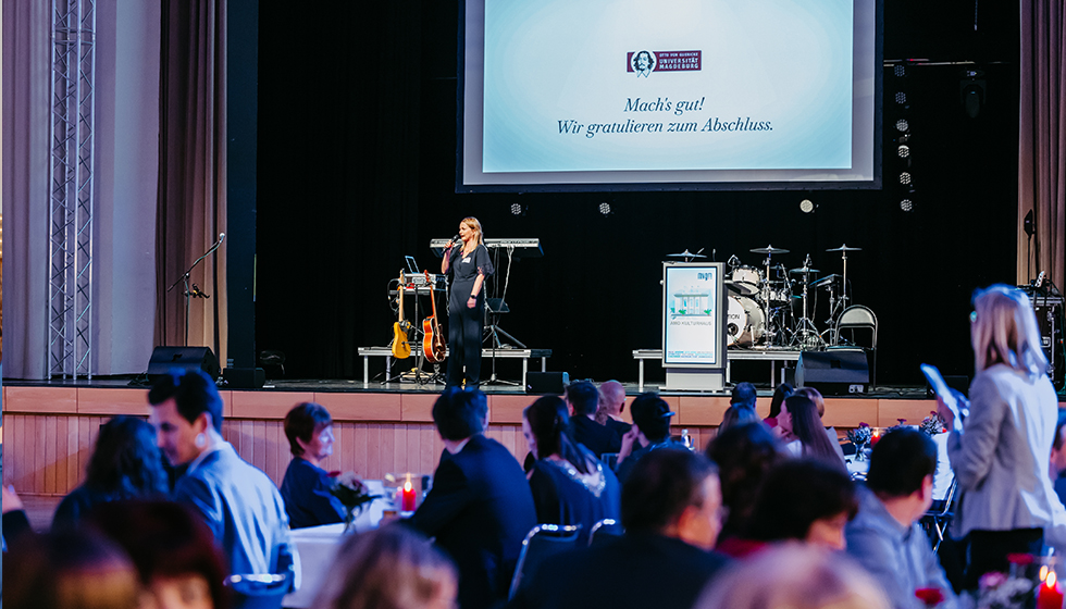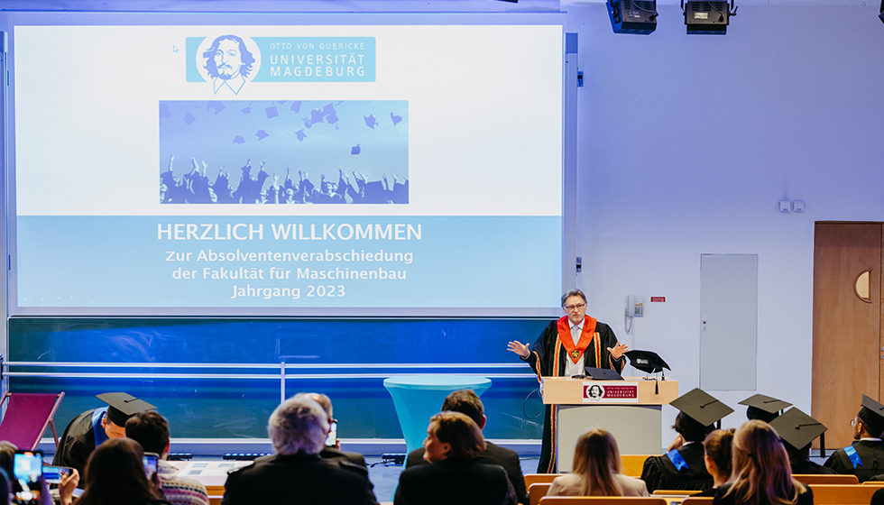 Welcoming the graduates at the decentralized graduation ceremony of the Faculty of Mechanical Engineering 2023 (photo: Jana Dünnhaupt | Uni Magdeburg)